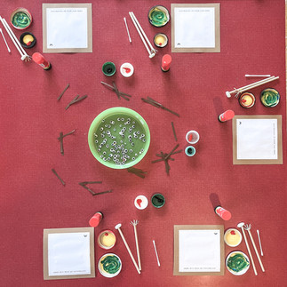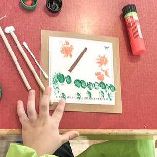 Die Kinder haben einen Ast aufgeklebt und mit zwei Stempeln eine schöne Karte kreiert. Dabei ging es um das Mischen von Farben:
