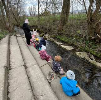 Die Kinder haben Baumrinden in den Bach geworfen und beobachtet wohin sie schwimmen. Sogar einen Regenwurm konnten wir noch beobachten.